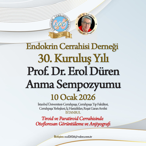 Endokrin Cerrahisi Derneği'nin 30. Kuruluş Yıldönümü'nde yakın zamanda aramızdan ayrılan duayen hocalarımızdan ve Endokrin Cerrahisi Derneği kurucularından Prof. Dr. Erol Düren adına İstanbul Üniversitesi Cerrahpaşa, Cerrahpaşa Tıp Fakültesi, Cerrahpaşa Yerleşkesi, İç Hastalıkları Reşat Garan Amfisi'nde "Tiroid ve Paratiroid Cerrahisinde Otofloresan Görüntüleme ve Anjiografi" konulu anma sempozyumu düzenlenecektir.