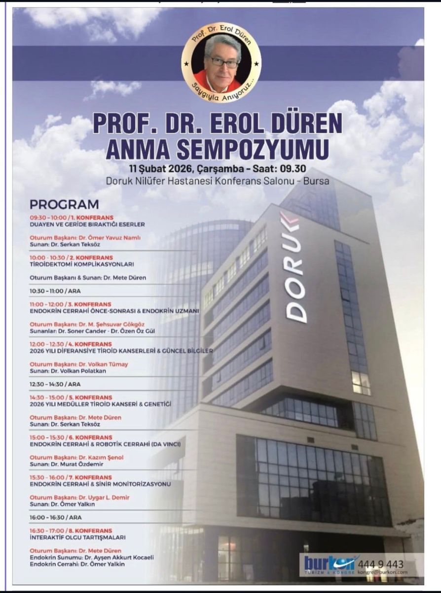 Prof. Dr. Erol.Düren Anma Sempozyumu 11 Şubat 2026 Çarşamba günü saat 09:30'da Bursa Doruk Nilüfer Hastanesi Konferans Salonu'nda gerçekleşecektir.