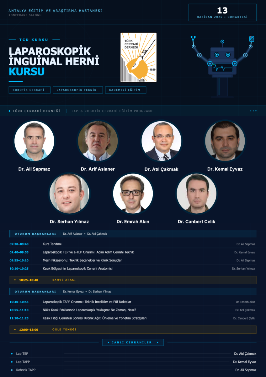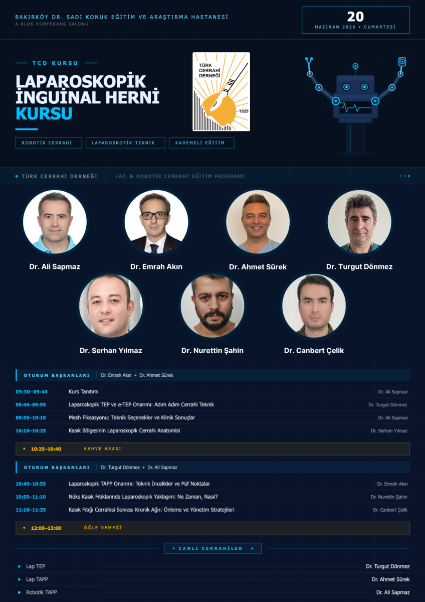| 09:40-09:55 | Laparoskopik TEP ve e-TEP Onarımı: Adım Adım Cerrahi Teknik | Dr. Turgut Dönmez |